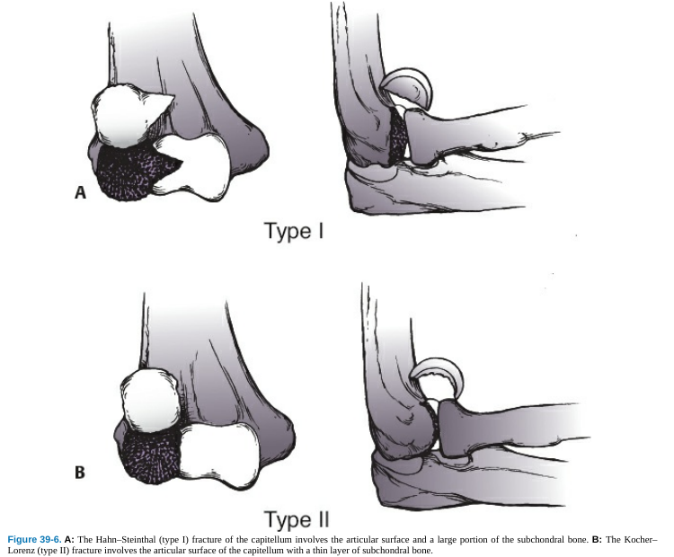 Tipo II: Superfície articular do capítulo + osso subcondral - rara (Kocher-Lorenz)